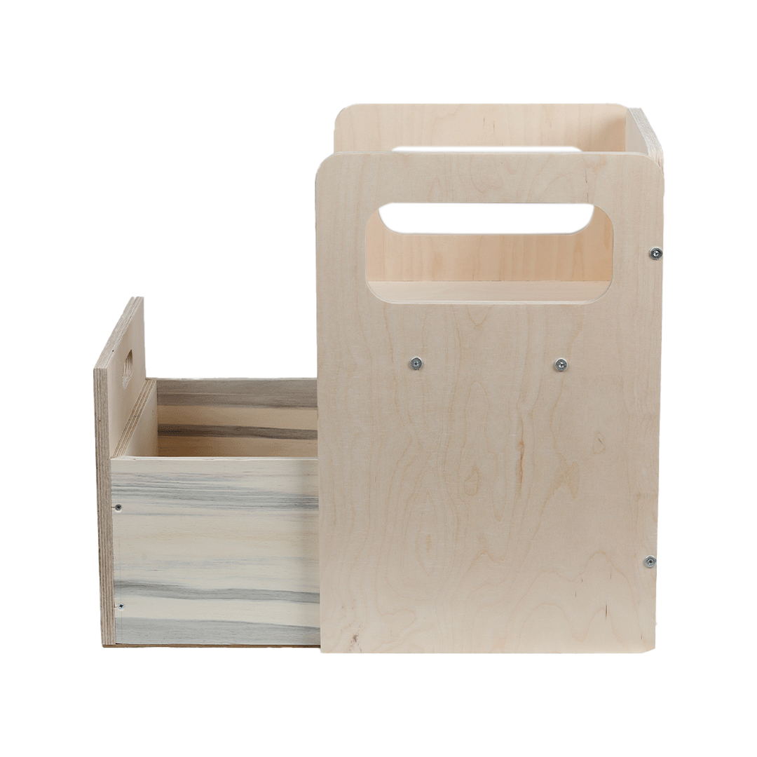 Fonksiyonel Tasarım: Üst kısmı dayanıklı bir tabure/basamak, alt kısmı ise oyuncak saklama ünitesidir.